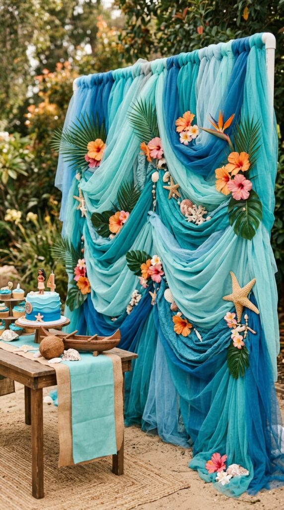 Tulle and fabric backdrops are honestly one of my favorite DIY routes for Moana parties because they’re surprisingly affordable and forgiving for beginners. You can layer ocean-inspired blues and teals using tulle layering techniques that create gorgeous depth without complicated sewing skills.