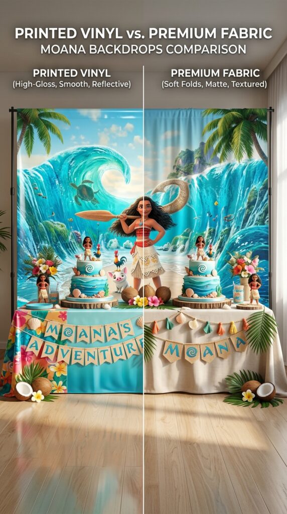 When it comes to Moana party backdrops, printed vinyl banners and fabric photo backdrops are the two most popular ready-made options — and they’re genuinely different beasts.