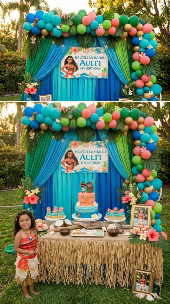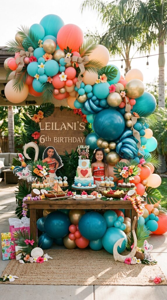 Balloon arches are honestly one of the most versatile — and budget-friendly — ways to build a stunning Moana backdrop, and they’re easier to pull off than you’d think. Mix turquoise, coral, and gold balloon shapes to capture that tropical ocean vibe instantly.