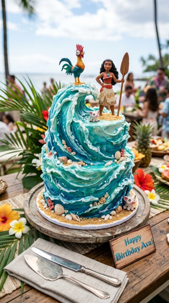 The ocean wave cakes inspired by Moana are honestly some of the most jaw-dropping designs you’ll find in the world of birthday cakes. Using realistic ocean wave icing techniques, bakers sculpt buttercream or resin-style fondant into rolling, translucent waves that look genuinely alive.