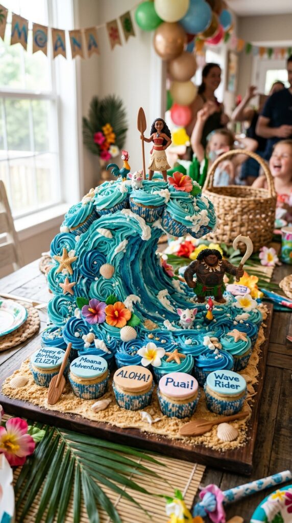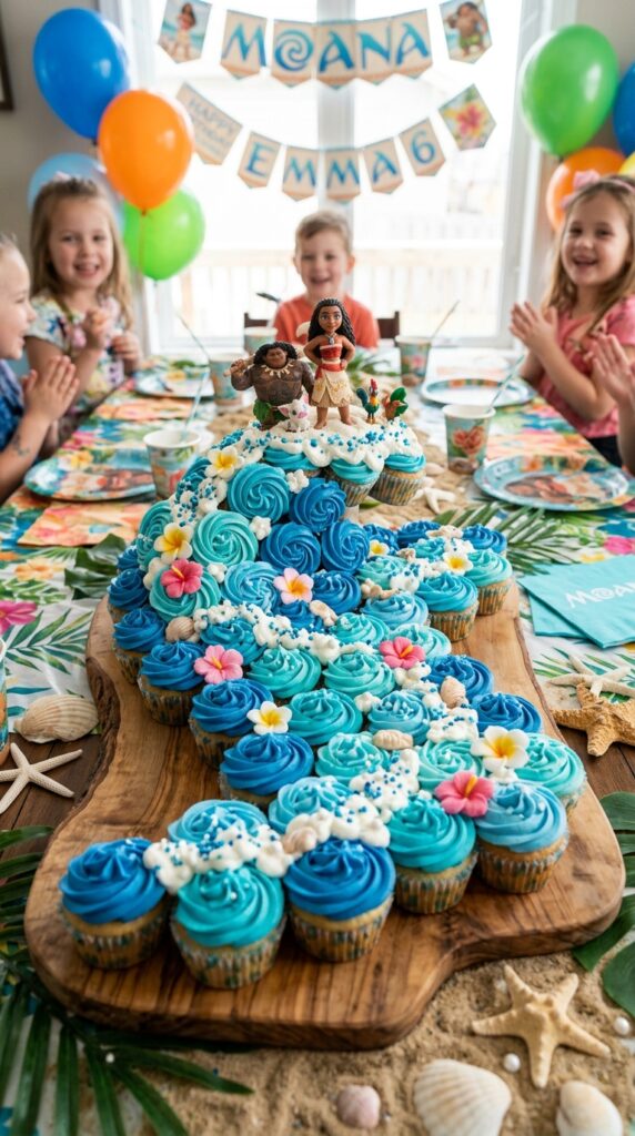 Add decorative toppers like Moana figurines, hibiscus flowers, or mini paddles to complete the look. You can even include personalized messages on individual cupcakes, spelling out the birthday child’s name across the design. Functional and festive — that’s a win.
