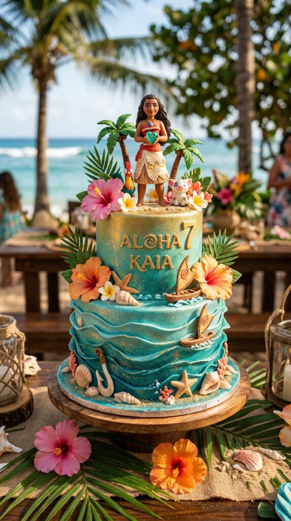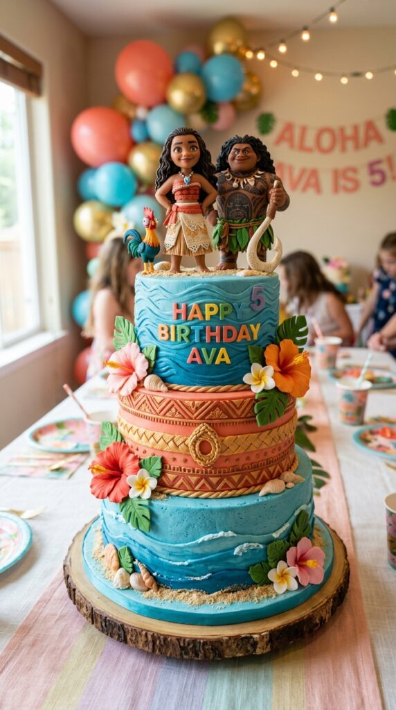 Adding painted watercolor designs in oceanic blues, greens, and warm sunset tones makes the whole cake feel alive. Request this style from your bakery early — talented decorators book fast, especially during summer birthday season. Pairing your cake display with a Moana-themed backdrop can elevate the entire party setup and make for truly unforgettable photos.