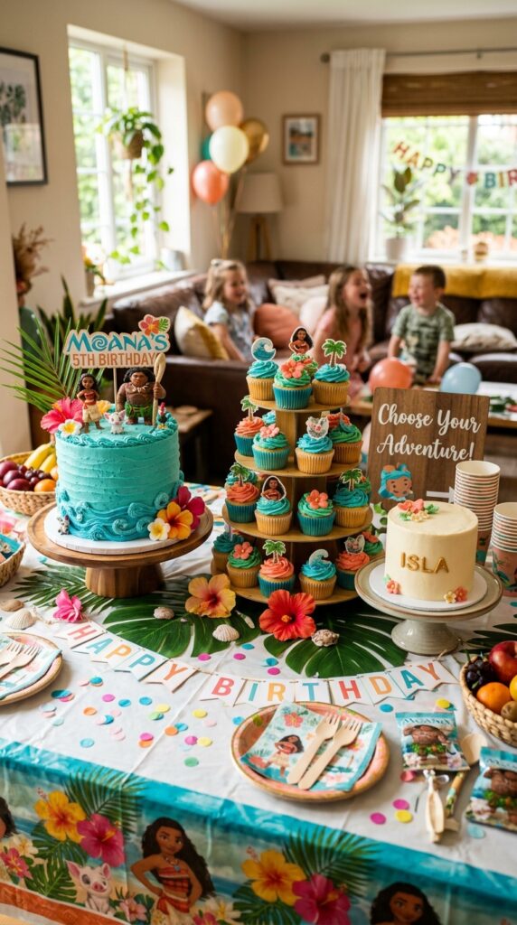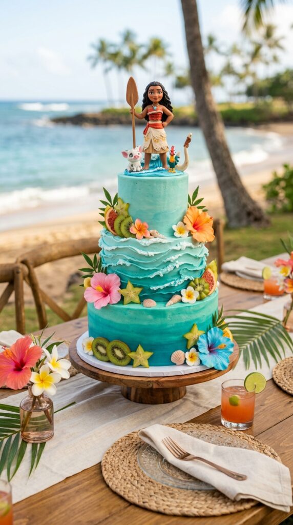 To complement the cake table, consider surrounding it with tropical celebration dishes inspired by island flavors like pineapple, coconut, and passion fruit that tie the whole spread together. Top it with a small fondant Moana figurine, and honestly, guests won’t believe you didn’t hire a professional bakery.