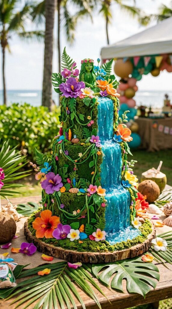 Decorate the outside with tropical fruit accents like sliced starfruit, kiwi fans, and edible hibiscus flowers. Add ombre blue-green frosting to suggest ocean waves cascading downward. It’s dramatic without being complicated.