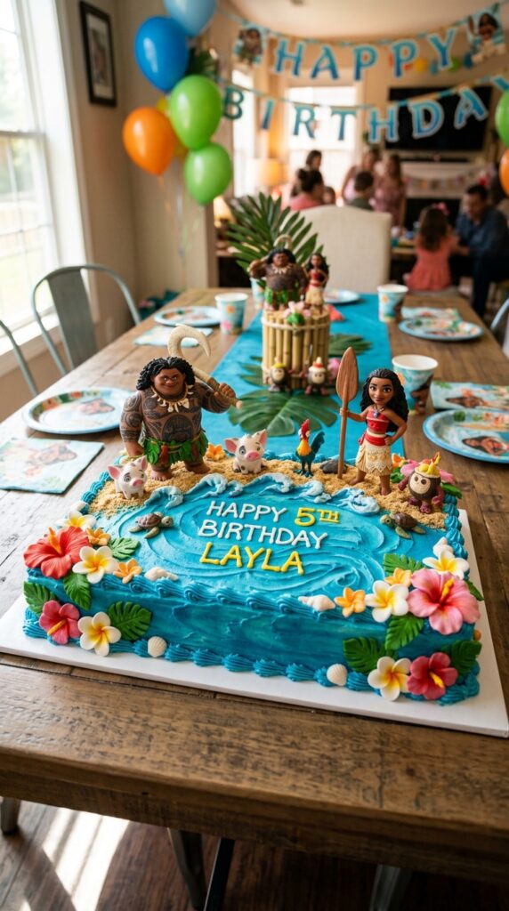 Sheet cakes are honestly one of the smartest choices you can make for a Moana birthday party, especially when you’re feeding a crowd. They’re easy to slice, serve, and decorate without the stress of stacking layers.