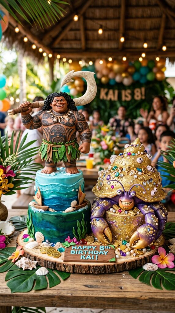 For character fans who want to go beyond Moana herself, Maui and Tamatoa cakes are an absolute showstopper choice. Epic Maui cakes typically feature his iconic hook, bold tattoos, and muscular fondant figure standing tall. They’re dramatic, detailed, and genuinely impressive.