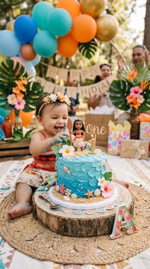 Smash cakes are one of the sweetest birthday traditions out there, and a Moana theme makes them even more magical. Keep moana smash cake designs simple — think ocean blue frosting, tiny shells, and soft florals your little one can actually dig into. You don’t need anything elaborate.