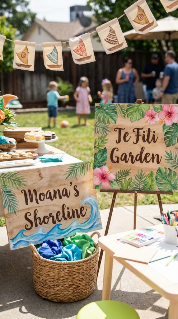 When the balloons, table settings, and decorations are all in place, signage is what pulls the whole story together. You’ll want unique hand lettered signage displaying phrases like “Moana’s Shoreline” or “Te Fiti Garden” to label each party zone clearly.