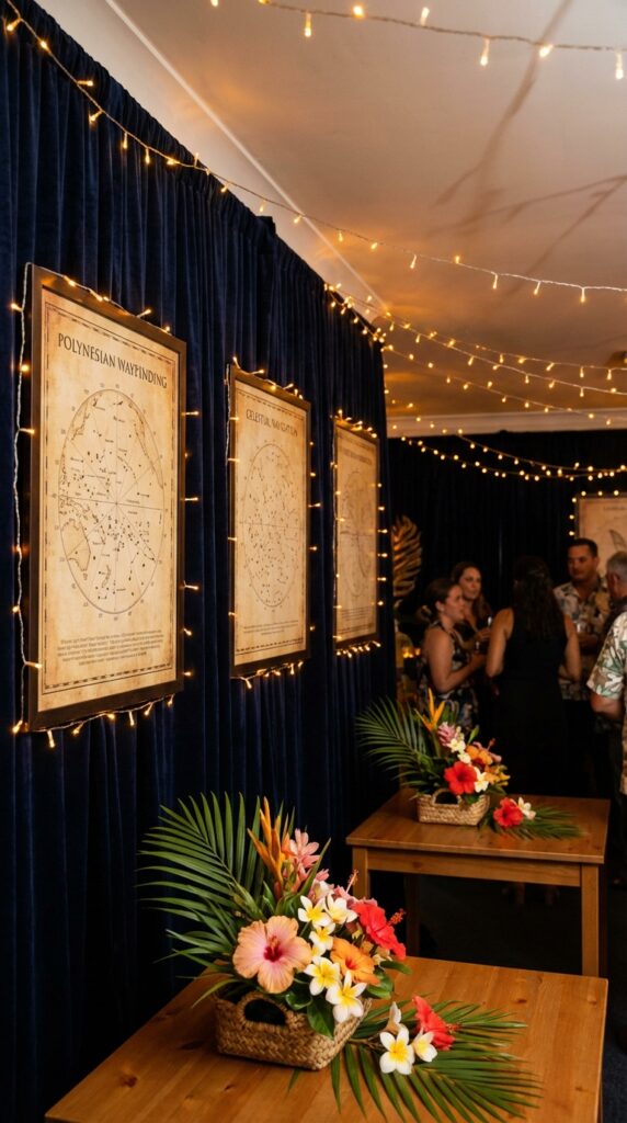 One of my favorite details from Moana is how wayfinding—the ancient Polynesian art of steering by stars—is woven so deeply into the story. You can bring that magic to life using constellation wall hangings printed with Polynesian star charts. Hang them near your food tables or entrance.