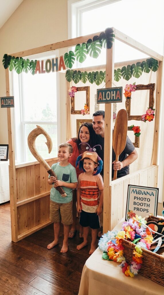 A well-designed image station can easily become the most-used spot at your whole party. Set up photo props highlighting characters’ expeditions, like Maui’s fishhook, Tamatoa’s glittering shell, and Moana’s oar.