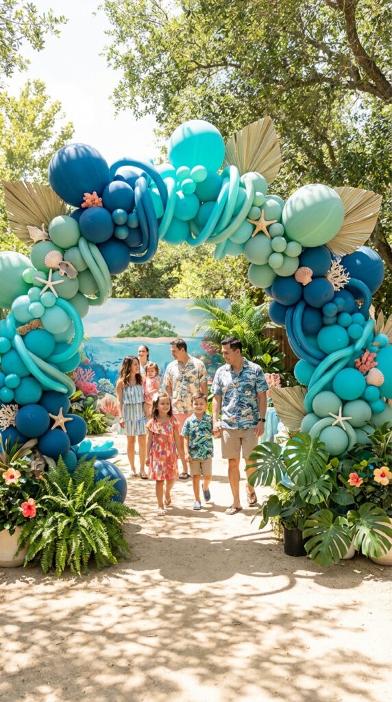 Layer ocean themed backdrops behind your arch for maximum visual impact. Think tropical foliage prints or coral reef graphics that complement your balloon colors beautifully.
