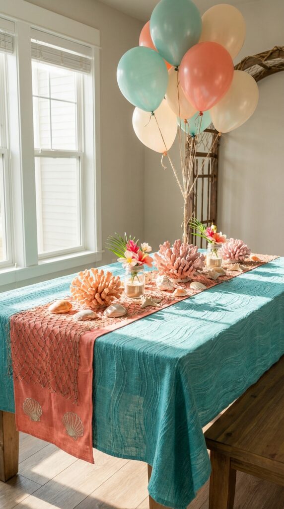 The teal and coral color combination is honestly one of the most versatile palettes you can work with for a Moana party. Layer teal tablecloths with textured ocean inspired linens to create that authentic island depth. Then scatter lively seashell accents across tables for natural, coastal charm.