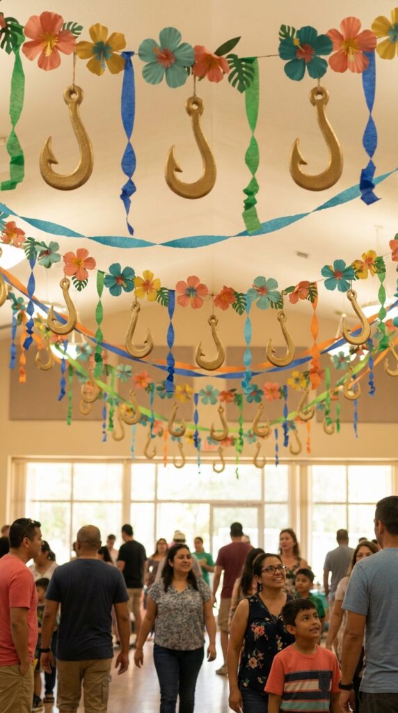 You can also weave hanging fishing lures between streamers to add playful oceanic texture overhead. Pre-made fish hook garlands work beautifully, but DIY foam versions painted gold cost almost nothing. Layer multiple heights — some low, some high — to create genuine depth. Your guests will actually stop and look up, which honestly doesn’t happen enough at parties. For a girl’s second birthday, Moana-inspired fish hook decor pairs especially well with soft, feminine touches like pastel florals and delicate shell accents woven throughout the space.