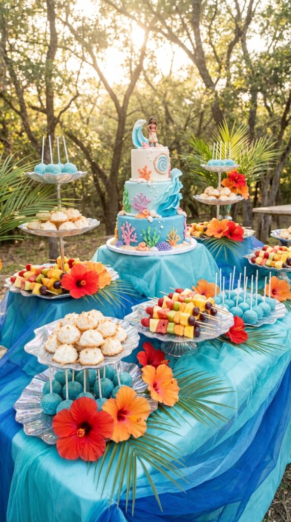 A Moana-themed dessert table isn’t just about the sweets — it’s a whole visual moment that ties your entire party together. Layer your table with blue and turquoise linens, then arrange sea shell dessert stands at varying heights to create depth and visual interest.