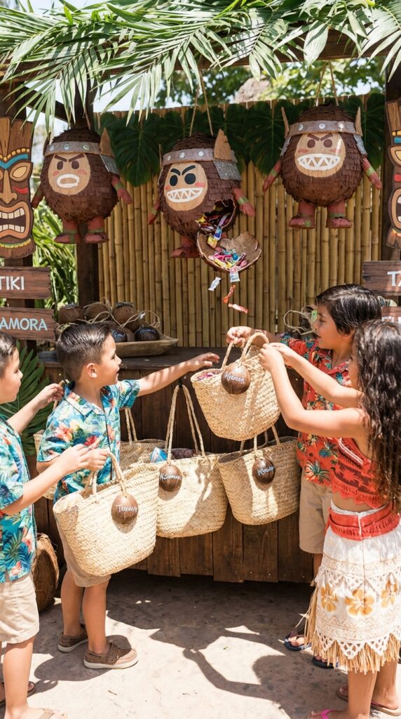 Consider arranging kakamora inspired piñata stations where kids swing for coconut-shaped treats filled with candy and small toys. Position the station near a decorated tiki backdrop for full effect.