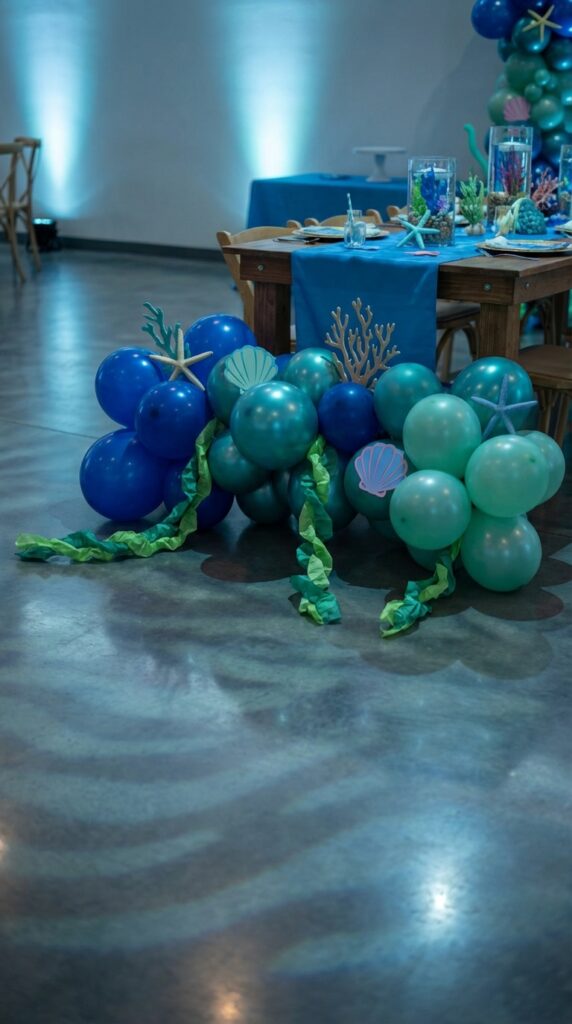 Few decoration elements alter a party space quite like balloon floor clusters — and when you’re building an underwater world, these low-lying arrangements are genuinely doing the heavy lifting.