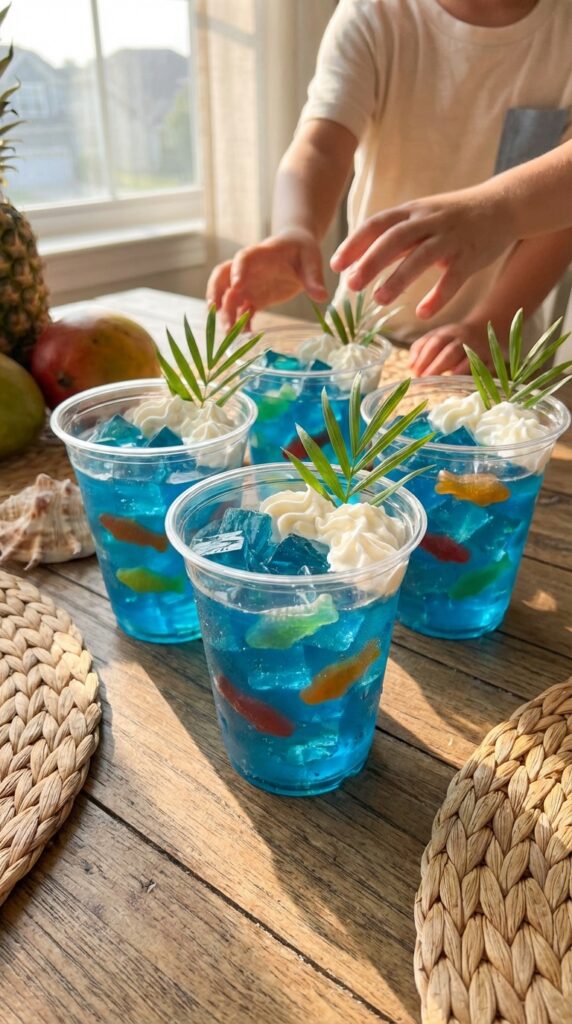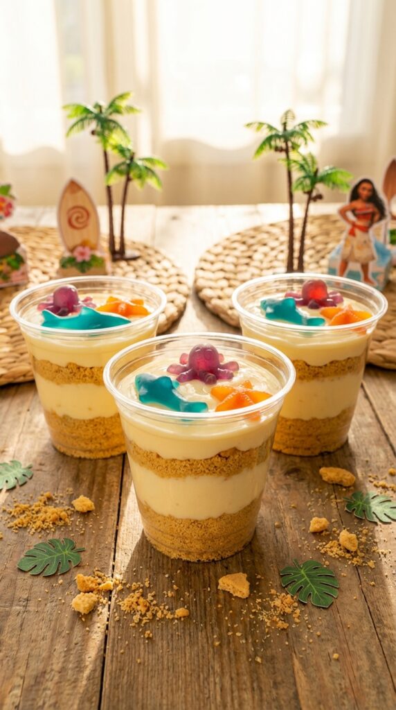 Layer your lively blue jello cubes with whipped cream to mimic ocean waves. Kids absolutely love digging through the “water” to find hidden gummy fish underneath. It’s surprisingly simple to make, yet looks incredibly impressive. To complete the tropical vibe, consider garnishing each cup with small palm leaves as a nod to the lush island scenery of Moana’s world.