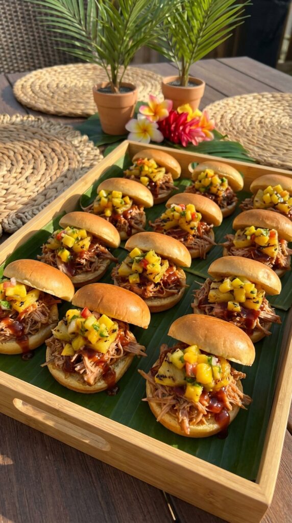 Top everything with grilled pineapple slices for that smoky-sweet island flavor kids absolutely go crazy for. You’ll want to add fresh mango salsa too — it brightens each bite with tropical freshness. These sliders feel authentically Polynesian without requiring serious cooking skills.