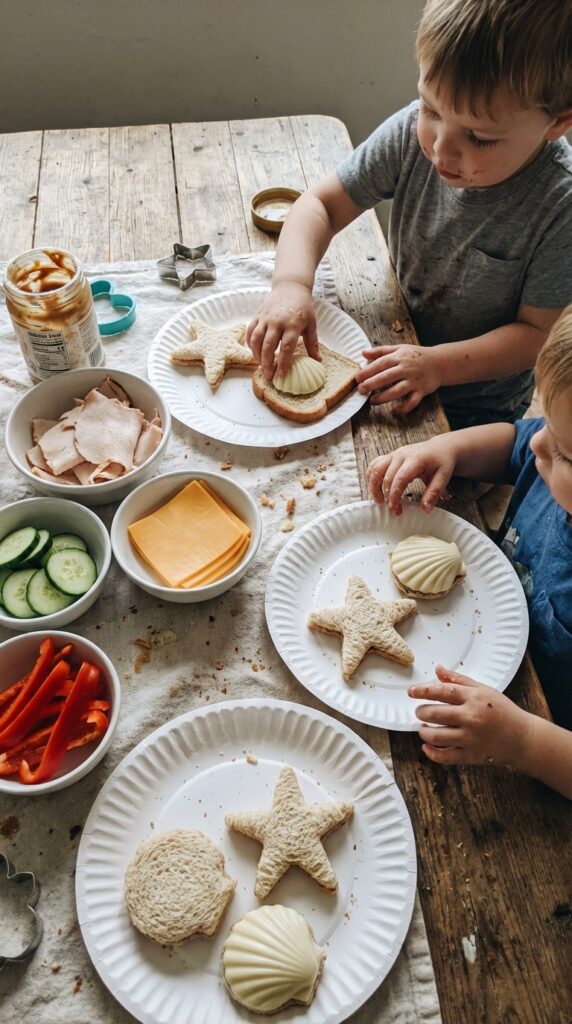 Use paper plate displays to showcase the cut-out shapes before assembly. Kids love picking their fillings, so offer turkey, cheese, and colorful veggies.