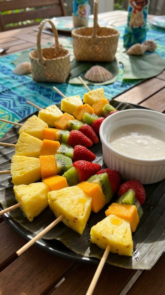 Thread pineapple chunks, mango slices, strawberries, and kiwi onto wooden skewers for a colorful presentation that practically screams “Moana party.” The revitalizing flavors balance out heavier snacks beautifully.