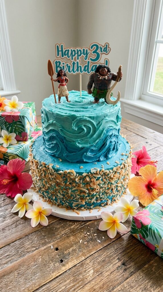 If you’re feeling adventurous, try decorative frosting designs using ocean waves in blue and teal buttercream. Press toasted coconut flakes around the sides for texture. Even beginner bakers can pull off something beautiful with the right tools and a little confidence. For a first birthday milestone, a single-tier smash cake decorated with gentle ocean colors and a simple Moana topper is a sweet and practical choice that keeps the design age-appropriate.