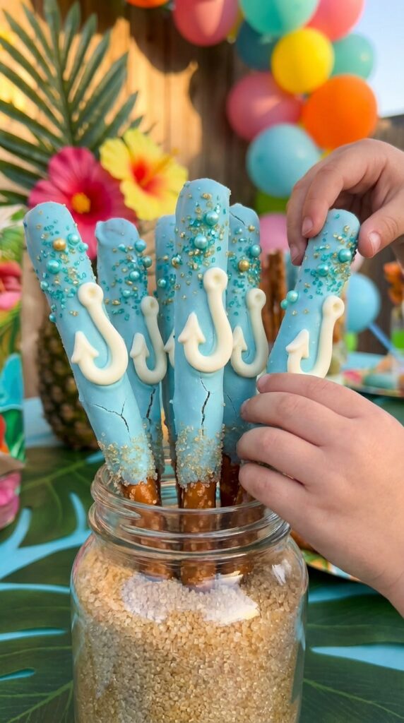 One of my favorite snacks to make for a Moana party is Maui’s Fish Hook Pretzel Rods — they’re fun, easy, and honestly pretty impressive for how little effort they take. Dip pretzel rods in blue candy melts, then curve white chocolate into a fish hook shape at the top.