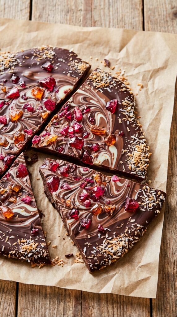 While those volcano cupcakes bring the fire, Te Kā herself deserves a place on your dessert table too. Melt dark chocolate, spread it thin on parchment, then swirl in a ganache design using white and milk chocolate.
