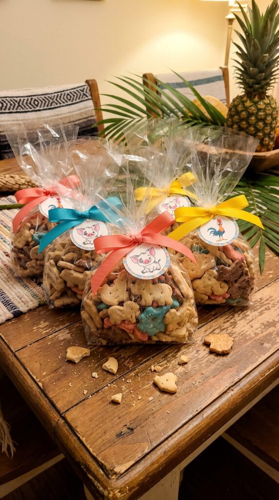 Plus, animal crackers are crowd-pleasing snacks that even picky eaters won’t argue with — unlike Hei Hei arguing with everything. These snack bags are especially popular as part of Moana-themed setups designed specifically for three-year-old birthday stars.