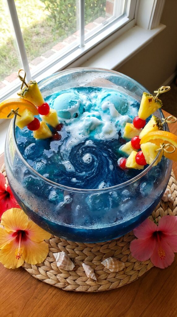 No party spread is complete without a show-stopping drink, and this tropical ocean punch delivers exactly that. Mix blue Hawaiian Punch with lemonade and pineapple juice for a lively blue punch that genuinely resembles the ocean. Add a scoop of blue raspberry sherbet on top, and it’ll create a gorgeous foamy wave effect as it melts.
