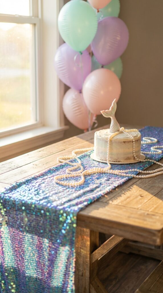 Start with shimmering sequin tails draped over chairs or hanging from the ceiling. These catch light beautifully and create instant magic. I’ve found that metallic scales work wonders as table scatter, while iridescent balloons mimic that otherworldly glow.