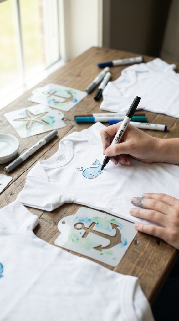 Set up a onesie decorating station where guests design personalized baby onesies using fabric markers and ocean stencils. You’ll create adorable keepsakes while entertaining everyone.