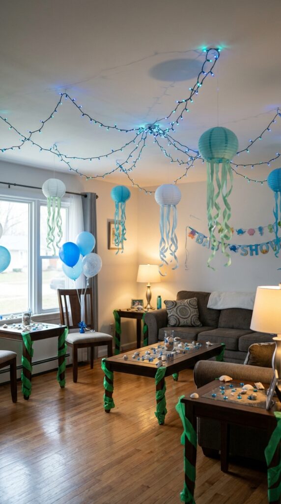 For underwater themed lighting, string blue and teal fairy lights across the ceiling or wrap them around pillars. Dim the main lights and let these twinkling “water reflections” set the mood. Add hanging jellyfish made from paper lanterns with ribbon tentacles for a fanciful touch.