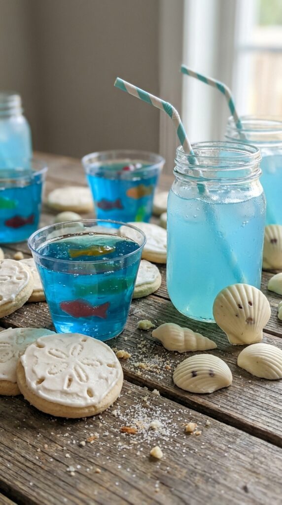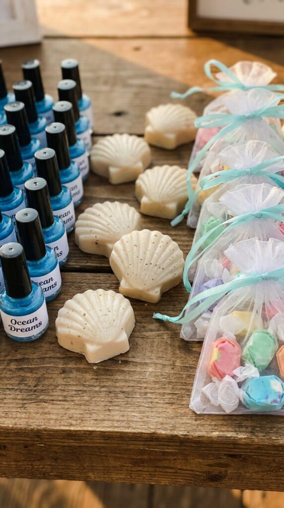 Mini bottles of blue nail polish labeled “Ocean Dreams” work perfectly – they’re cute and functional. Seashell-shaped soaps smell fantastic and fit any bathroom decor. For affordable ocean themed favors, consider saltwater taffy in organza bags or goldfish crackers in clear containers with ocean-blue ribbons.