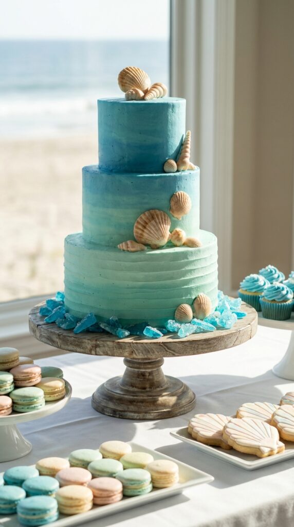 The centerpiece of your ocean-themed celebration deserves to make waves—literally and figuratively. Create a stunning tiered ocean cake display featuring gradient blue frosting that mimics ocean depths. Start with deep navy at the bottom, blending to seafoam green at the top.