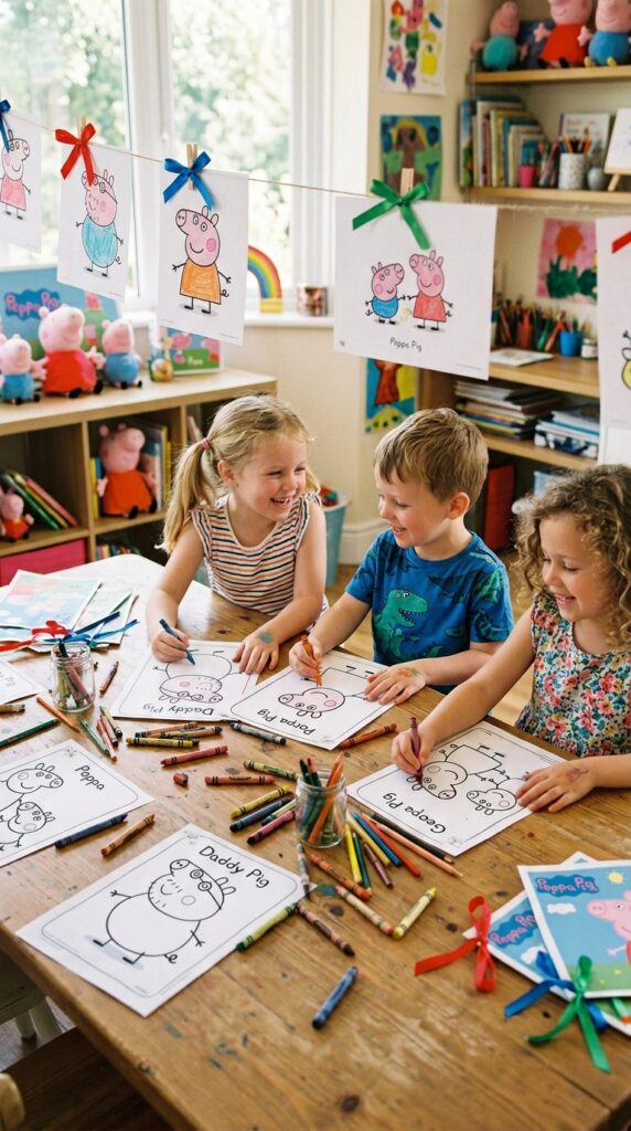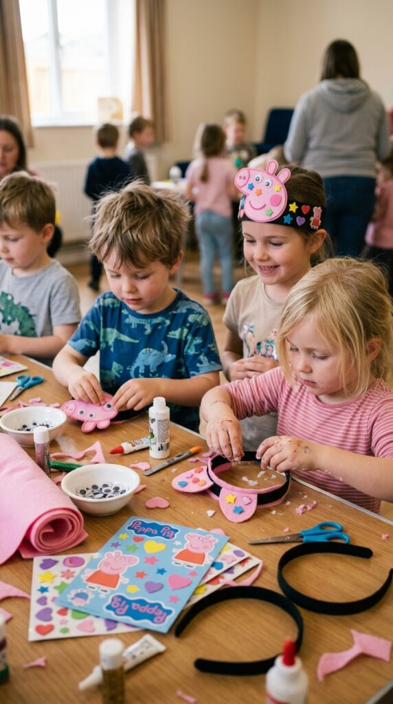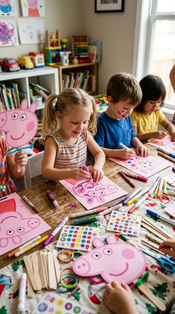 Setting up a DIY Peppa Pig mask craft station is one of the easiest ways to keep kids engaged and give them something to take home. Print out Peppa’s iconic round face on cardstock beforehand, then let kids personalize their mask designs with markers, stickers, and glitter glue.