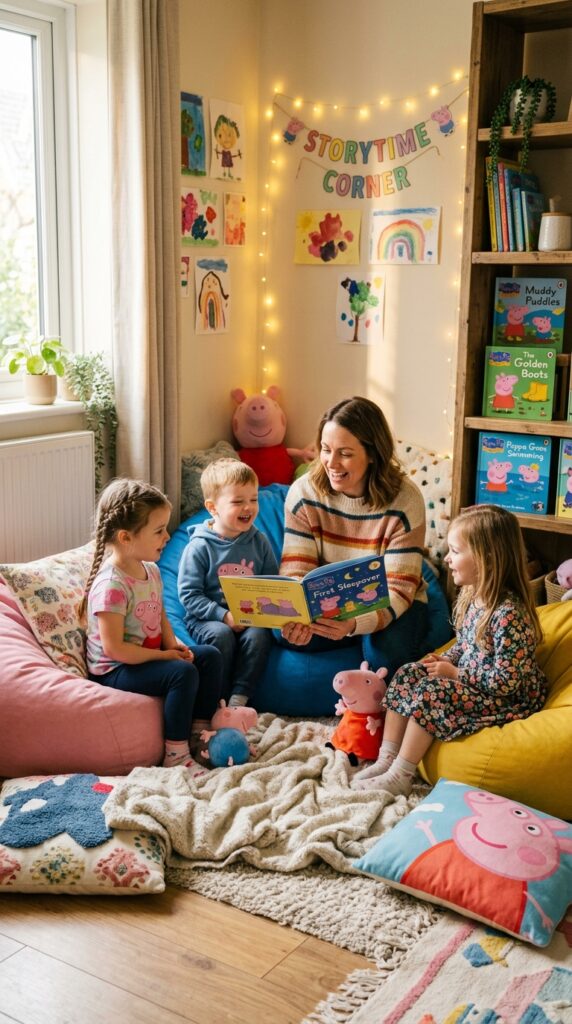 A cozy Peppa Pig Storytime Corner converts any birthday party into something genuinely memorable. Grab some bean bags, soft blankets, and fairy lights to create a snug reading nook.