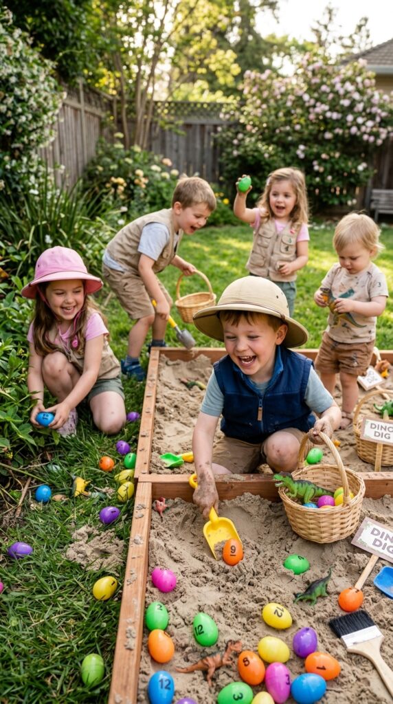 You can even create a dinosaur excavation station where children dig through kinetic sand to uncover hidden dino figures — instant fossil revelation excitement!