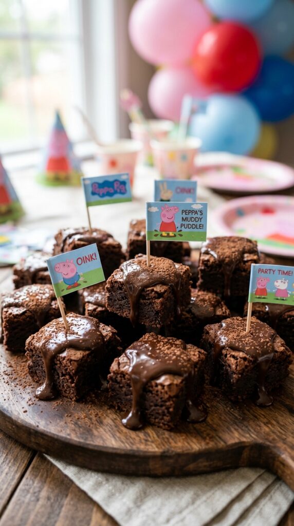 If there’s one treat that perfectly captures the spirit of Peppa Pig’s favorite activity, it’s these muddy puddle brownie bites. You’ll bake a standard brownie batch, cut them into small squares, then add a dark chocolate drizzle across the top. That drizzle creates a gorgeous muddy puddle effect kids absolutely go crazy over.