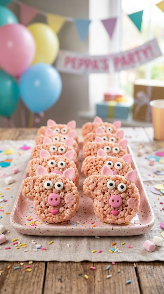 These Peppa Pig Rice Krispie treats are genuinely one of the easiest showstoppers you can pull off for a birthday party. You’ll shape the marshmallow treats into simple pig faces, then use pink food coloring and candy eyes to bring them to life.