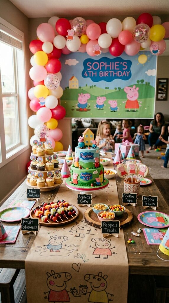 A Peppa Pig backdrop behind your dessert table instantly elevates the whole setup and gives guests a fun spot for party photos.