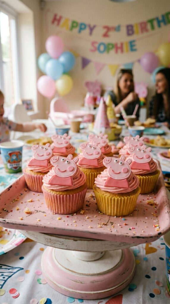 Cupcakes are honestly the MVP of Peppa Pig party food — they’re portion-perfect, easy to grab, and way less stressful to decorate than a full character cake.