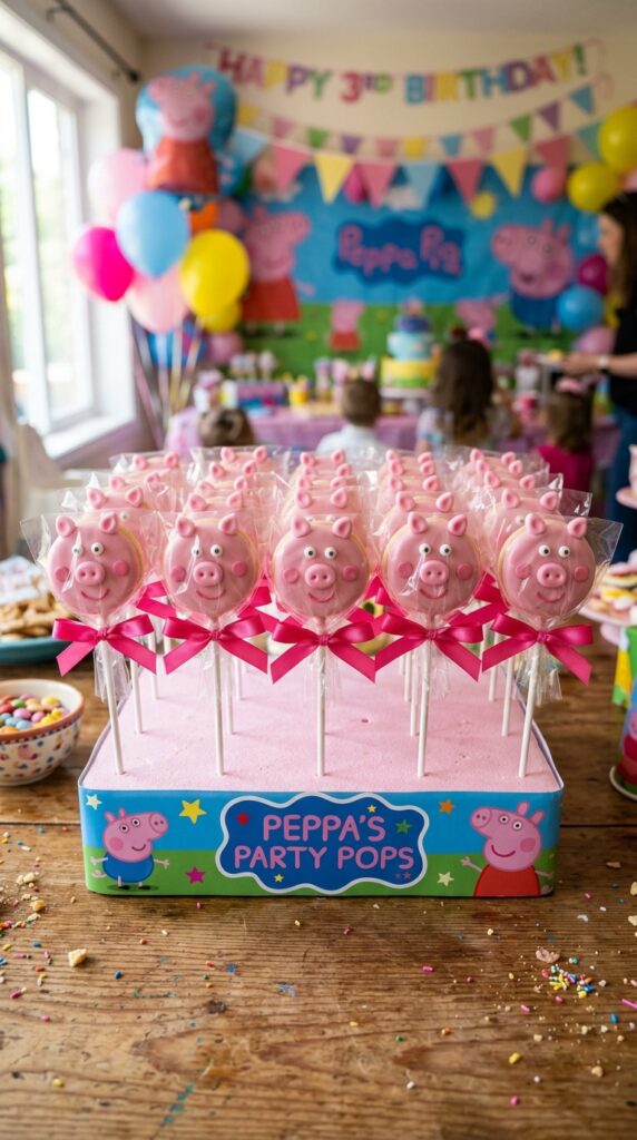 Display them upright in a foam block decorated with peppa pig decorations for a stunning dessert table centerpiece that doubles as instant party décor. For an even more festive setup, pair your cookie pop display with Peppa Pig centerpiece ideas that add a playful, cohesive touch to your party tables.