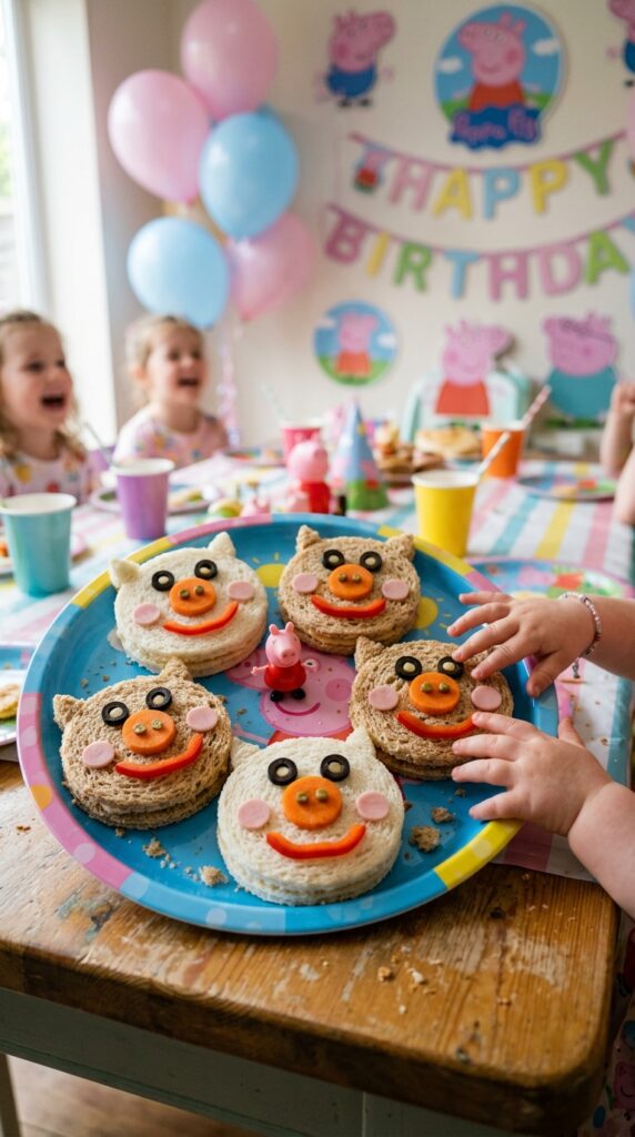 Sandwiches might seem too simple for a party spread, but shaped and decorated the right way, they become one of the most crowd-pleasing peppa pig food ideas you can make.