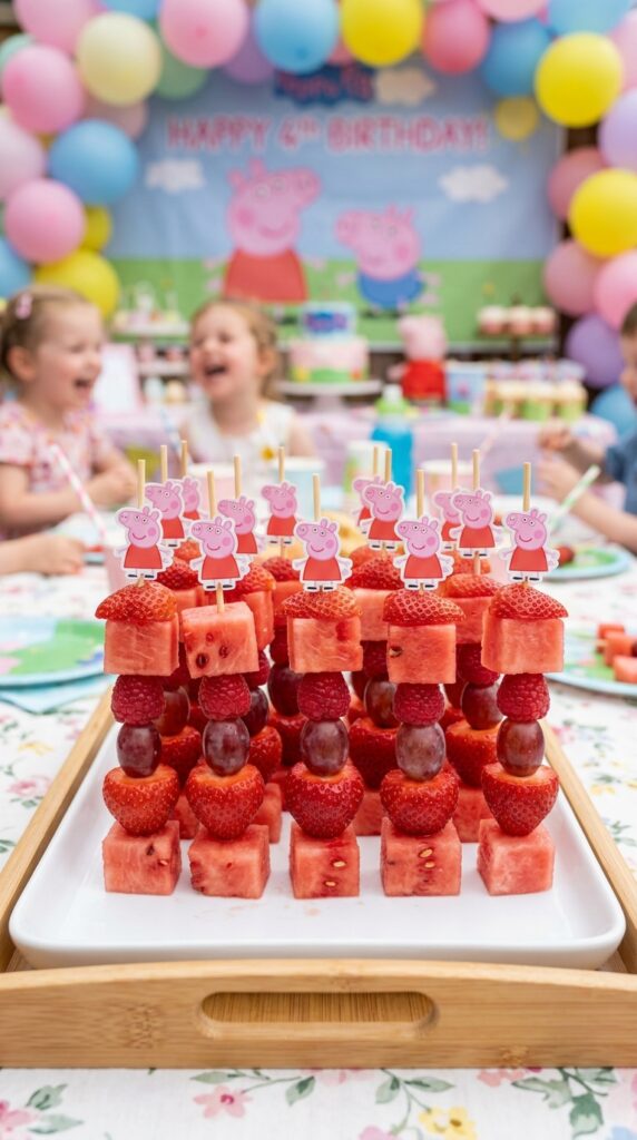 For skewer decorations, add small Peppa Pig character picks at the top — you’ll find these easily on Amazon or party supply stores.