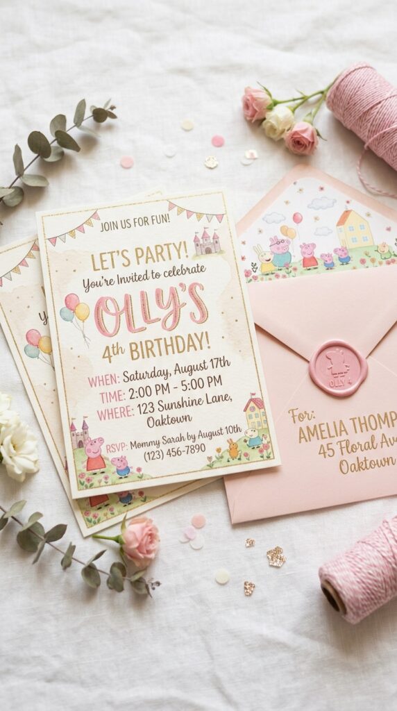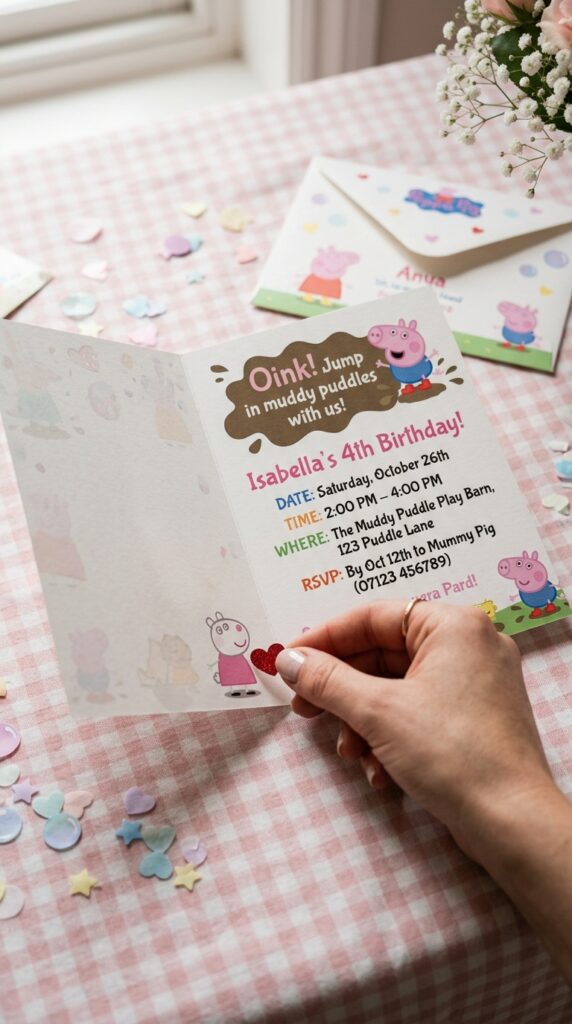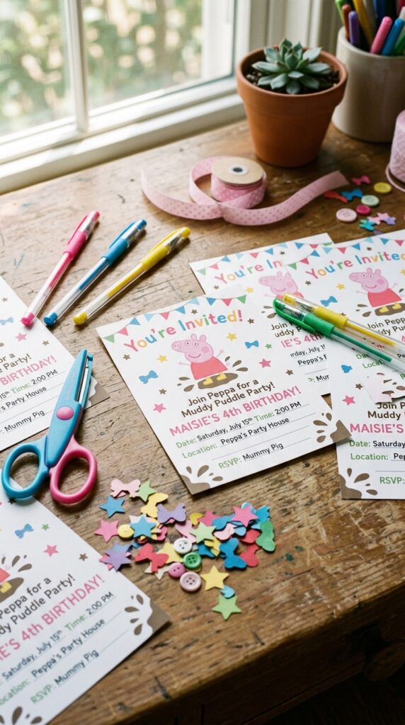 Cut invitation shapes like Peppa’s iconic face for extra charm. Your creative designs don’t need to be perfect — they just need heart.