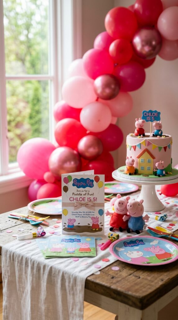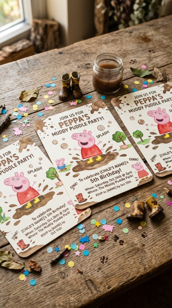 Design your invites with brown splatter effects and Peppa mid-jump to instantly capture that playful energy.