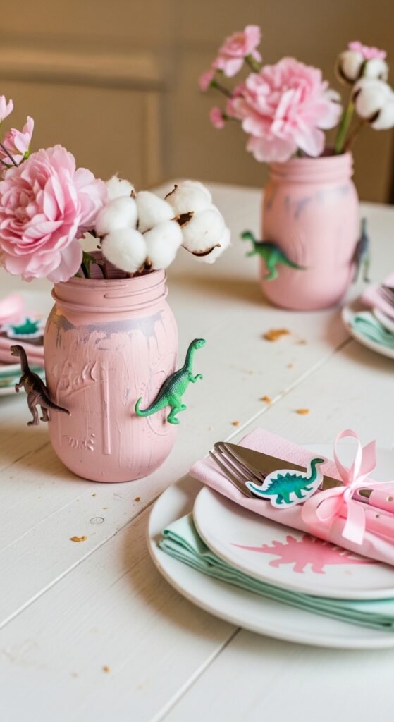 Transform mason jars into floral dinosaur centerpieces by hot-gluing small plastic dinosaurs around the rim, then spray-painting everything pink. Fill with cotton candy pink flowers for instant table magic.