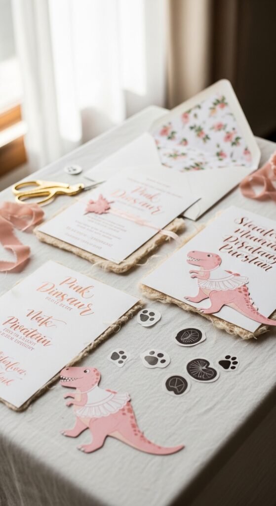 You’ll want dinosaur themed stationery that screams “prehistoric princess.” Think pastel pink T-rexes wearing tutus or gentle brontosauruses surrounded by flowers. I’ve found that craft stores carry adorable pre-made options, but handmade invitations really steal the show.