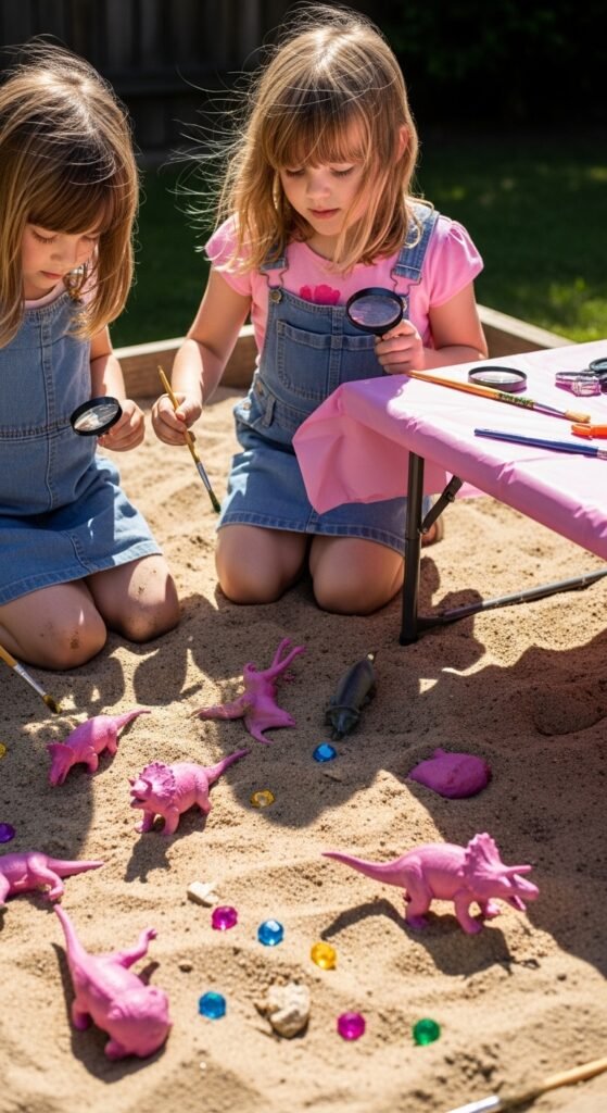 Set up a paleontologist dig site using a sandbox filled with buried plastic dinosaurs and gems. Give each princess a small brush and magnifying glass – they’ll feel like real scientists making findings while staying perfectly pink and pristine.
