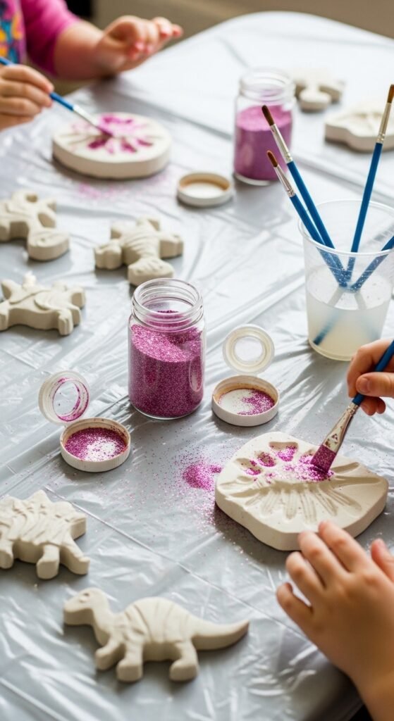Station one: glitter encrusted fossils. Mix plaster of Paris, press toy dinosaurs into molds, then let kids brush on pink and silver glitter while they’re still damp. Trust me, the mess is worth it.